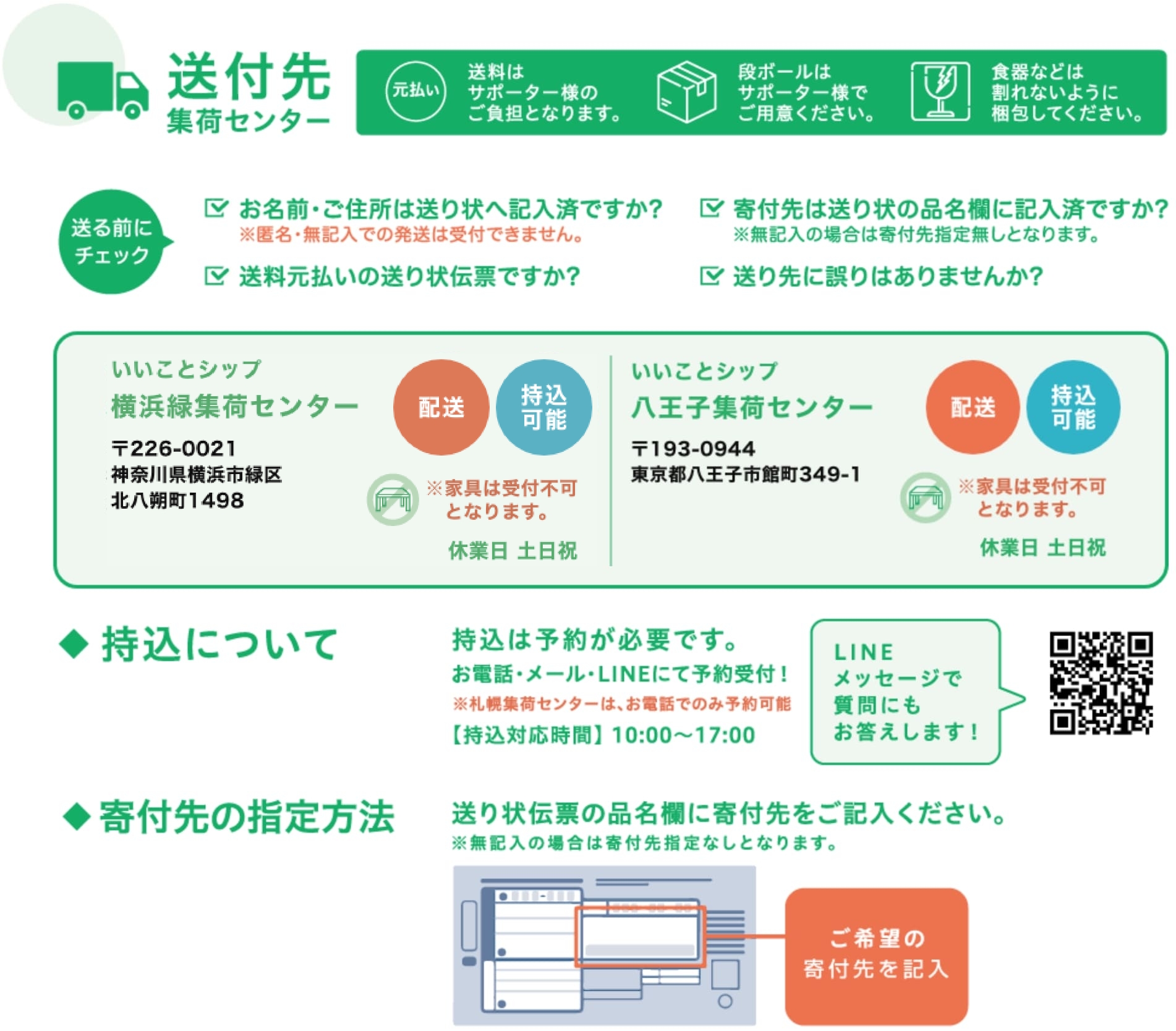サポーターの皆様からお送りいただいたお品物を国内外で再販したり一部寄付したり、フードバンクに寄付を行ったりして、お送り頂いたお品物1箱につき100円を弊社が責任を持って捻出し、皆様にお選び頂いた寄付先に寄付させていただいております。