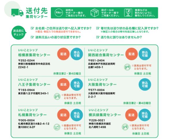 寄付品は着払いではなく、元払い(送料自己負担)で、指定の集荷センター宛にご発送ください。宛先や送り方の詳細は、以下または公式サイト「いいことシップ – ECO to SHIP -」内の「送付先」で確認できます。